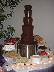 THIS ELEGANT FOUNTAIN STANDS 44 INCHES TALL AND ADDS A SPLENDID TOUCH TO ANY EVENT. YOUR GUESTS WILL BE DELIGHTED TO DIP THEIR FAVORITE ITEMS IN OUR PURE MELANO CHOCOLATE. AVAILABLE IN DARK, MILK OR WHITE. OUR EXPERT STAFF MAKES THIS EXQUISITE DISPLAY AVAILABLE TO YOU HASSLE FREE